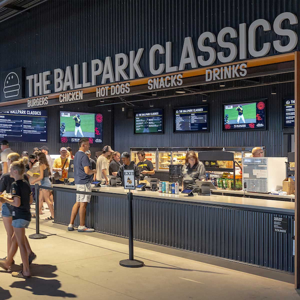 Concession staples including burgers, hot dogs, fries, popcorn and ice cream.